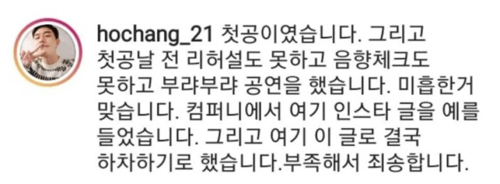 김호창은 이후 공식적인 사과를 요구 받자 분노에 차 인스타 스토리에 글을 한번더 남깁니다. 글의 내용은 왜 내가 공식적인 사과를 해야되냐, 당신이 중요한것이 아니라 뮤지컬 팀을 위해서 다 내린거다. 당신의 펜질 하나로 몇명이 피해를 본지 아냐라며 꼬리내린것으로 착각하지마라고 글을 적었습니다.