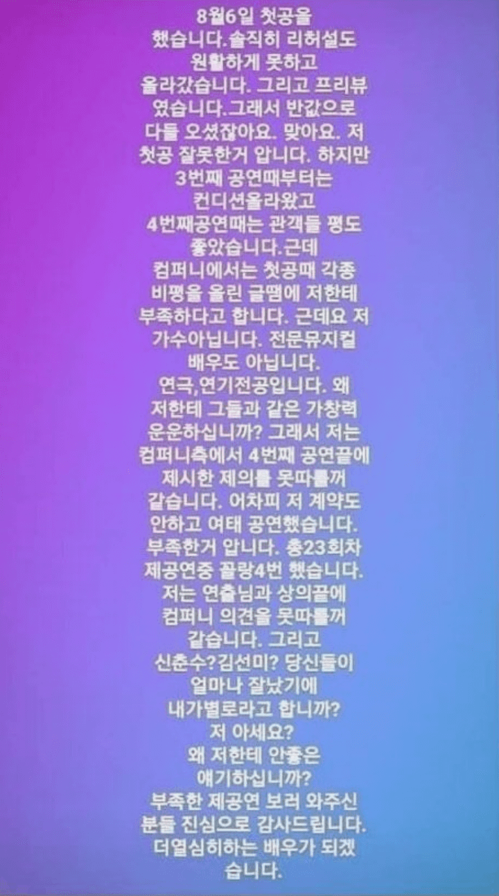 또한 자신은 회사와 계약도 하지 않은채 진행해왔고, 23번의 공연중 꼴랑 4번만 진행했으며, 제작자인 신춘수와 김선미의 실명을 언급하며 자신을 지적한 것에 대하여 얼마나 잘났길래 나를 지적하냐라고 반박했습니다. 이후 자신의 공연을 보러와준 분들께 감사하며 열심히 하는 배우가 되겠다고 작성했습니다.