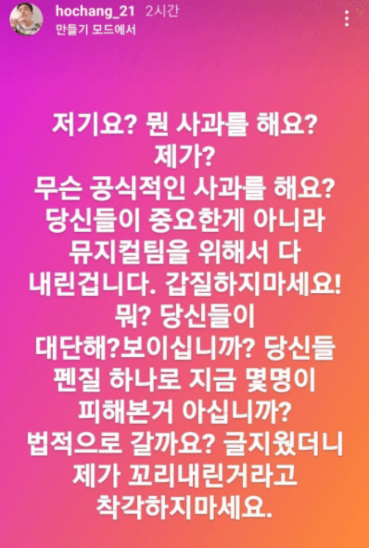 김호창은 이후 공식적인 사과를 요구 받자 분노에 차 인스타 스토리에 글을 한번더 남깁니다. 글의 내용은 왜 내가 공식적인 사과를 해야되냐, 당신이 중요한것이 아니라 뮤지컬 팀을 위해서 다 내린거다. 당신의 펜질 하나로 몇명이 피해를 본지 아냐라며 꼬리내린것으로 착각하지마라고 글을 적었습니다.
